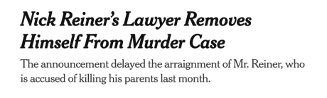 N.Y. Times excerpt: “[Jackson’s] departure was announced during a hearing in Los Angeles Superior Court, where Mr. Reiner, wearing a brown jumpsuit, was set to be arraigned on two counts of first-degree murder. It may suggest that the Reiner family — Nick has two siblings — has distanced itself from Mr. Reiner and his legal case, at least financially.”