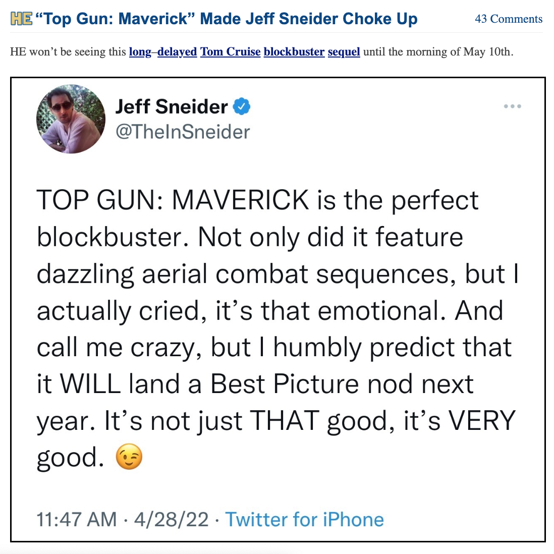 Who suspected until last week’s big Cinemacon screening that Top Gun: Maverick would turn out to be a heart movie? That it may (according to The Ankler’s Jeff Sneider) leave Joe and Jane Popcorn on the verge of choking up? Who had an inkling?