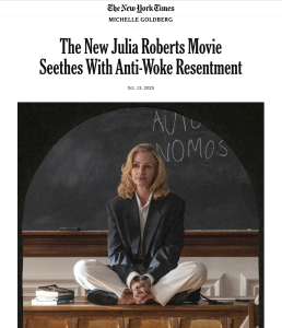 ..but at least she understands where Luca Guadagnino‘s After The Hunt is coming from. At least that. This declaration of disdain and skepticism against the wokey forces out there is the groundwater basis for my embrace of the film. On top of which Goldberg’s week-old article (10.13) doesn’t use the usual N.Y. Times scare quotes around the word woke…progress!
