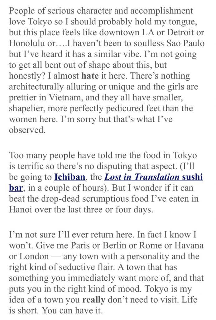“Have you ever been to Tokyo? I spent 36 hours there in 2012, did some walking around, sampled some of the food, etc.. Absurd as this sounds, I found it boring and even numbing, certainly from an architectural perspective. Huge and sprawling and lemme-outta-here. Many different neighborhoods and districts. But destroyed during WWII and very little sense of history remains. Has the same kind of urban corporate personality as Seoul or Shanghai or Dubai or Atlanta.