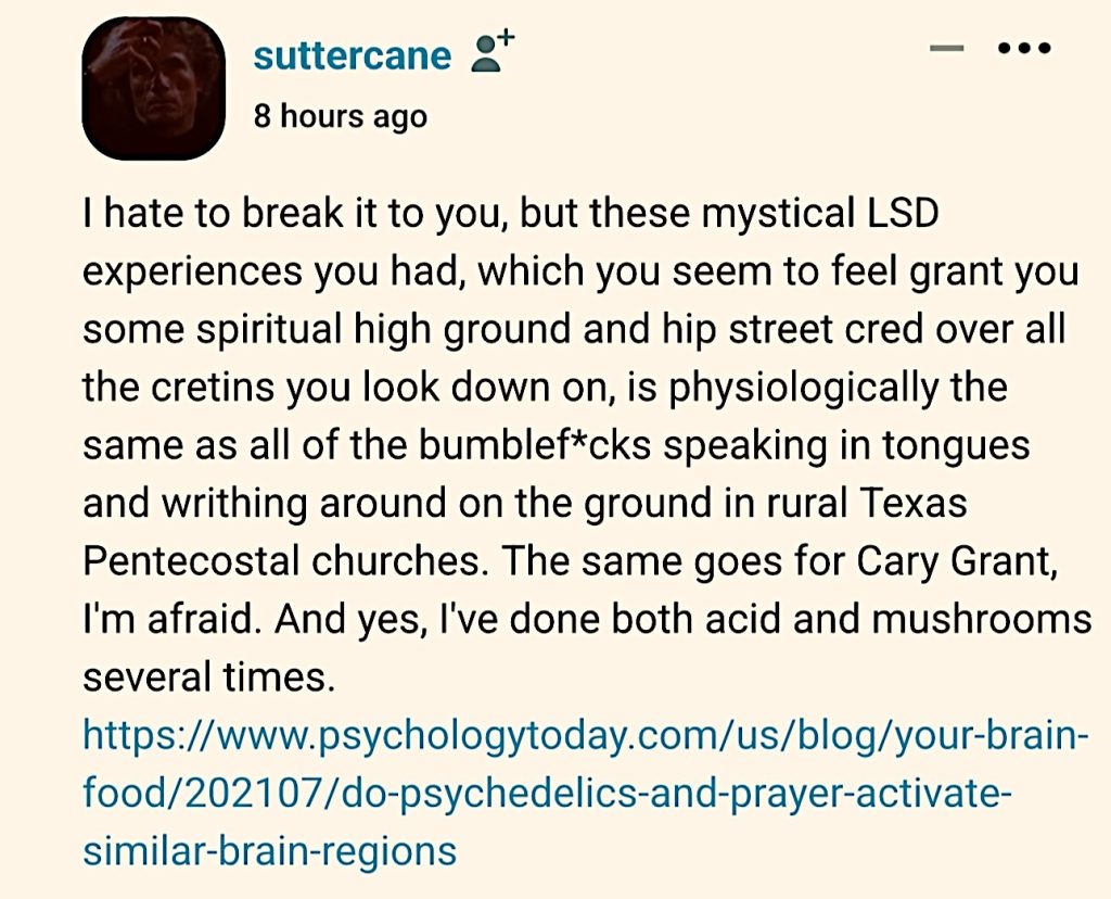 HE to Suttercane: You’ve “done both acid and mushrooms several times”, fine, but you evidently haven’t been called.