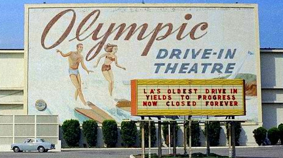As recently as 1973 there was a drive-in theatre at the corner of Olympic and Bundy. Really. It was called (wait for it) the Olympic Drive-In. The street-facing side of the screen featured a mural of a 20something couple riding a wave. It opened on 4.4.45 and closed on 10.14.73.
