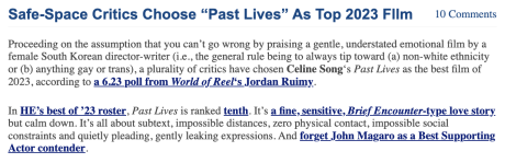 For months honest, down-to-earth people have been saying that Celine Song‘s Past Lives is fine but calm down. But agenda-driven critics, various friends of A24 and industry elites pushing gender and identity activism have refused to back down, and so Past Lives has won the Best Film award at the Independent Spirit Awards.