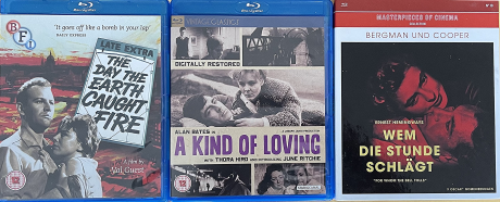 These guys would play just fine on my Region 2-adjusted Oppo Bluray player, which is still back in West Hollywood. Not “fine”, in fact…great. They won’t play on the domestic 4K Sony Bluray player, of course, and so they’re just dead tissue…sad, mute and forlorn. Blurays left to their own devices aren’t Blurays at all. No spin, no purpose. For Whom The Bell Tolls is HD streaming, of course. A Kind of Loving is streamable, but apparently not in HD. I’d be fine with streaming The Day The Earth Caught Fire, but apparently the only HD option is to buy the Kino Bluray, which popped in July 2020.