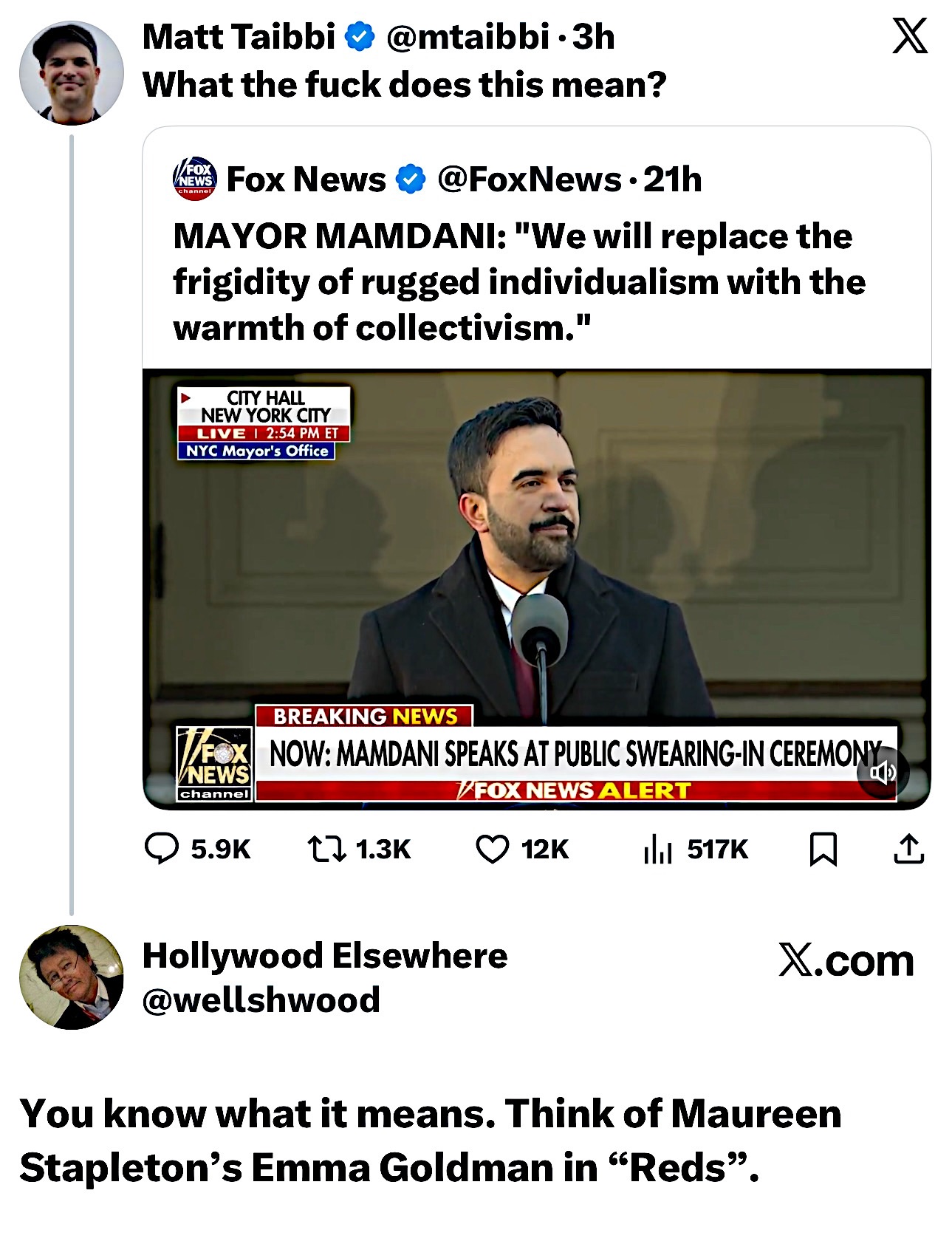 And so on and so forth. Congrats to the new mayor of the five boroughs. But why did James begin by asking Mamdani to say the word “I”? Isn’t that kind of lame? If I’d administered the oath, I would have begun with…