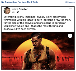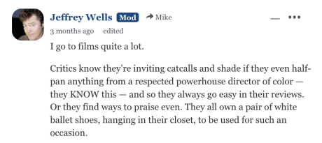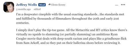 All the Metacritic and RT critics know there’s virtually no upside to slamming (or partially slamming) an ambitious Ryan Coogler movie that deals with deep-south racism and plays like a grindhouse flick from Sam Arkoff, and so they all put on their ballerina shoes before reviewing it.