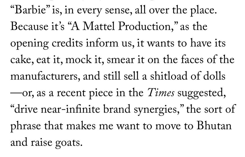 “Watching the first half-hour of Barbie is like being waterboarded with Pepto-Bismol.” — from Anthony Lane’s 7.20 New Yorker review.