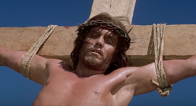 The best journey-of-Christ movie is Martin Scorsese‘s The Last Temptation of Christ followed by Pier Paolo Pasolini‘s The Gospel According to St. Matthew. But in an odd way King of Kings has a special vibe due to Hunter’s Nazarene, who is at once Hollywood-fake and yet captivating and soothing. That handsome face, that nut-brown hippie hair, those light blue eyes, and that red-and-white outfit that he wears during the Sermon on the Mount scene.