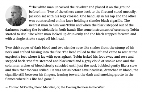 I’ve only read three of his books — “Blood Meridian or The Evening Redness in the West” (’85), “All the Pretty Horses” (’92) and “No Country for Old Men” (’05).