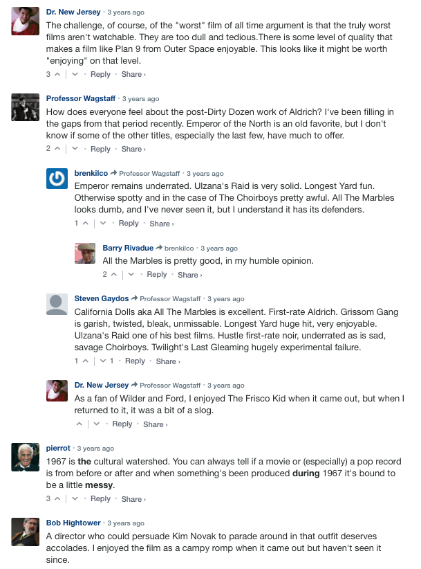 “Maybe an amusing macabre pastiche could have been made of it if the director, Robert Aldrich, hadn’t been so clumsy; it’s a static piece of filmmaking. With Michael Murphy, George Kennedy and Ernest Borgnine, who has rarely been worse — he demonstrates his shouting range.” — Pauline Kael on Robert Aldrich‘s The Legend of Lylah Clare (’68).