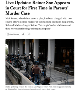N.Y. Times shoe-leather duo Tim Arango and Soumya Karlamangla reported around 1:15 pm eastern that Reiner had “appeared briefly in court on Wednesday morning.” The 32-year-old Reiner’s physical appearance in court doesn’t appear to jibe with other accounts, but then I wasn’t there.