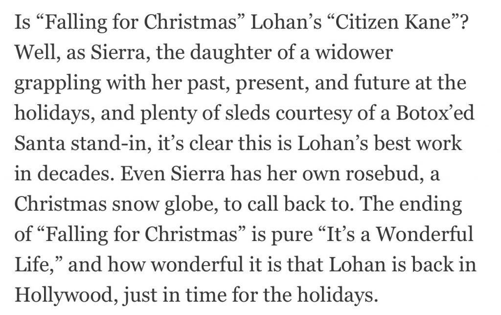 Pull Quote Flim-Flam November 13, 2022November 12, 2022 by Jeffrey Wells In fact, IndieWire’s Samantha Bergeson didn’t write the Citizen Kane pullquote in her 11.10 review of Lindsay Lohan’s Falling for Christmas, although she does bend over backwards to be kind.