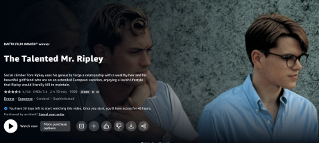Last week I rewatched the final three episodes of Steve Zallian‘s Ripley and then decided to re-watch Anthony Minghella‘s The Talented Mr. Ripley as well as Rene Clement‘s Purple Noon (’60).