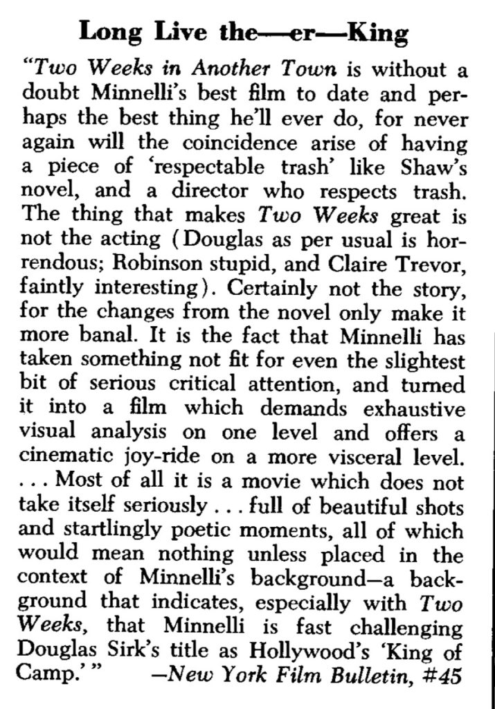 Sirk-Minnelli Connection August 7, 2025 by Jeffrey Wells Pauline Kael review of Vincent Minnelli’s Two Weeks in Another Town: