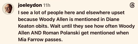 Joe Leydon is completely correct. When Mia Farrow passes, the expansively written obits and summing-up essays will have no choice but to conclude that, like all successful actresses, she was a very shrewd and calculating careerist who boosted her profile and cultural standing big-time by connecting with Woody Allen in the ’80s. And that she turned feral and ferocious in August ’92 over you-know-what and that Moses Farrow knows a thing or two about that (as do many others), and that she’s long praised and stood solidly behind her genius-level Rosemary’s Baby director, Roman Polanski, and admirably so.
