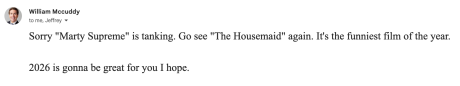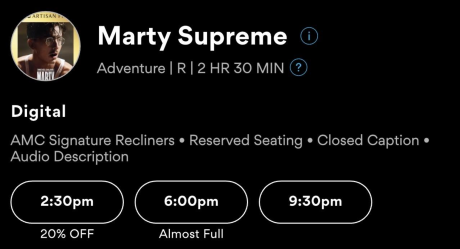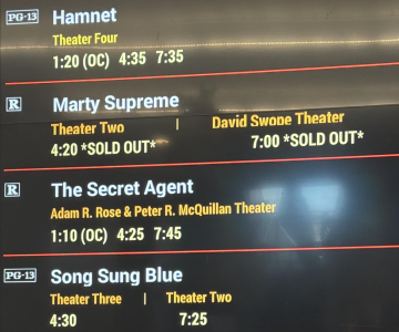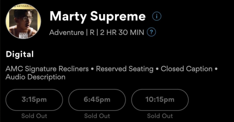 Late yesterday afternoon at the Jacob Burns Center in Pleasantville, two successive showings of Marty Supreme were sold out. At the AMC Westport today (Thursday, 12.25) three showings of Marty Supreme are currently sold out, according to the AMC app. And a 6 pm showing at the AMC Sono is nearly sold out.