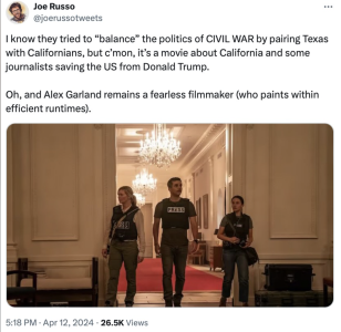 …finally stands up and says it. I understand director Alex Garland and A24 spewing the bullshit about how Civil War is actually a tribute to brave journalism — they don’t want to alienate red-state audiences — but a majority of critics saying the same thing or pretending that the film to is too vague to get a handle on….that’s just denial and cowardism.