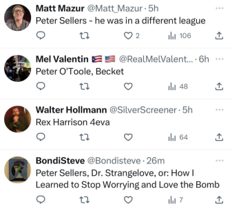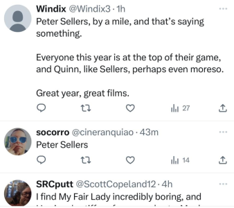 The long-established consensus is that Rex’s Harrison Best Actor Oscar for his My Fair Lady performance was, at the very least, unfortunate, particularly given the calibre of the competition — Peter O’Toole and Richard Burton in Becket, Anthony Quinn in Zorba the Greek, and Peter Sellers‘ trio of performances in Dr. Strangelove, or: How I Learned to Stop Worrying and Love the Bomb.