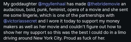 And the proof of this HE proclamation is Jamie Lee Curtis having recently posted an “attagirl…so proud of your artistic courage!” tweet for Bride director Maggie Gyllenhaal.