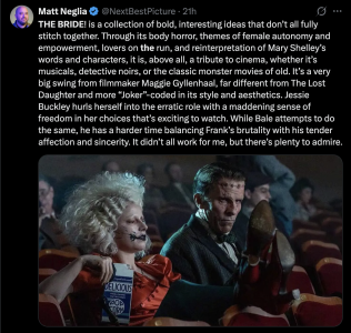 Maggie Gyllenhaal’s #TheBride is wild, audacious, & dgaf if you like it. Buckley & Bale thrill in a movie that feels like what JOKER: FOLIE A DEUX desperately wished it was. Gyllenhaal’s script has a lot of threads it doesn’t weave in perfectly. unlike anything out there. pic.twitter.com/EtQCaUe1NJ