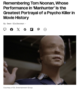After reading Owen Gleiberman‘s perfectly phrased, deeply felt article about the legacy of Tom Noonan, I want to watch Manhunter again. And I’ve seen it three or four times.