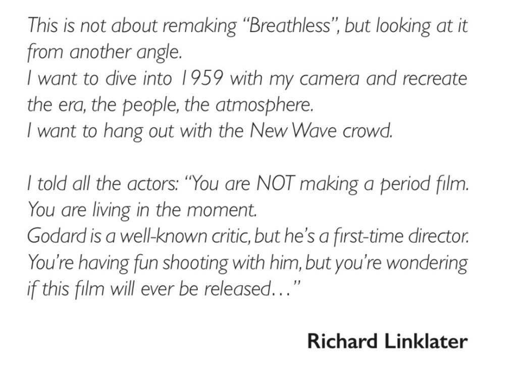 There isn’t a single aspect of Richard Linklater Nouvelle Vague — a concise, boxy, black-and-white, you-are-there reenactment of the making of Jean-Luc Godard’s groundbreaking Breathless, 66 years ago on the streets of Paris….there isn’t a single scene or line or shot that didn’t strike me as wholly, deliciously authentic and note-perfect.
