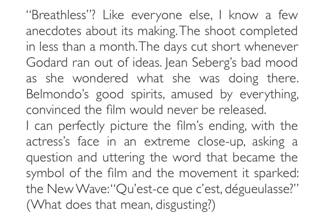 The handmade, little-film atmosphere shared by Breathless and Nouvelle Vague is the selling point of course…same vibe, same moves….both feel sharp, nervy, tight but impetuous, nimble, unpretentious — and are both focused, of course, on the same influential chapter in cinema history.