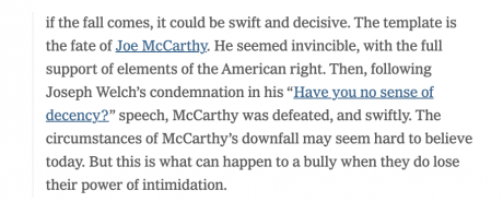 On 6.9.54, the legend of the venal Senator Joseph R. McCarthy took a hit that he never recovered from. The demagogic dragon was “finally slain,” as a commentator says in the below PBS clip.