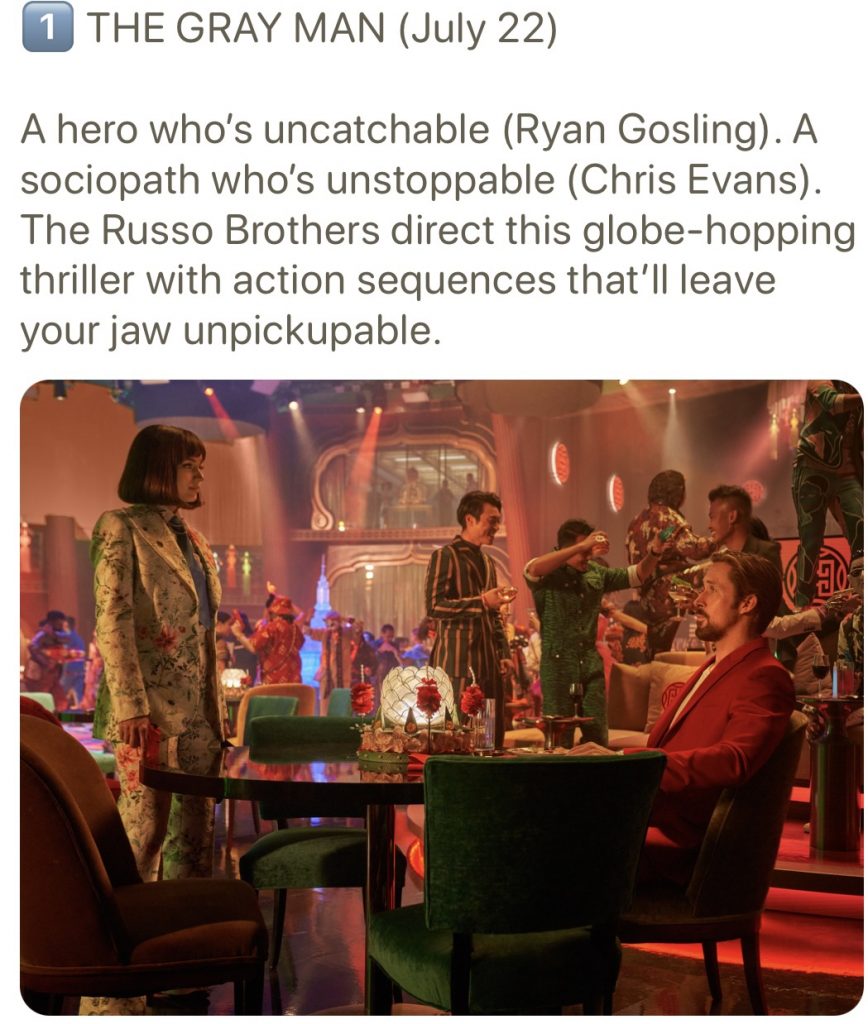 The mere sound of this deplorable word is like chalk screeching on a blackboard. It makes me shudder. The person who wrote this copy should be fined. Put it this way: My interest in watching The Gray Man just plummeted. It may be unresuscitatable.