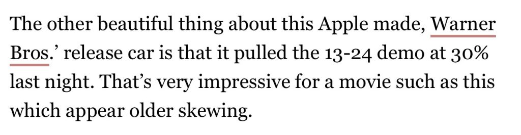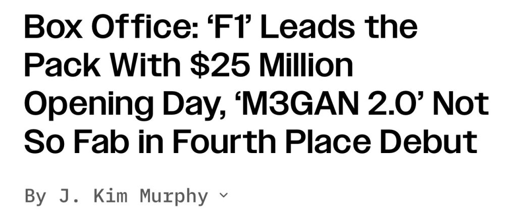 Vigorous “F1” Opening Weekend Earnings (Bobby Peru Is Feelin’ Blue) June 28, 2025June 28, 2025 by Jeffrey Wells Deadline’s Anthony D’Alessandro on Friday morning: A likely weekend tally of at least $55 million, and perhaps higher.