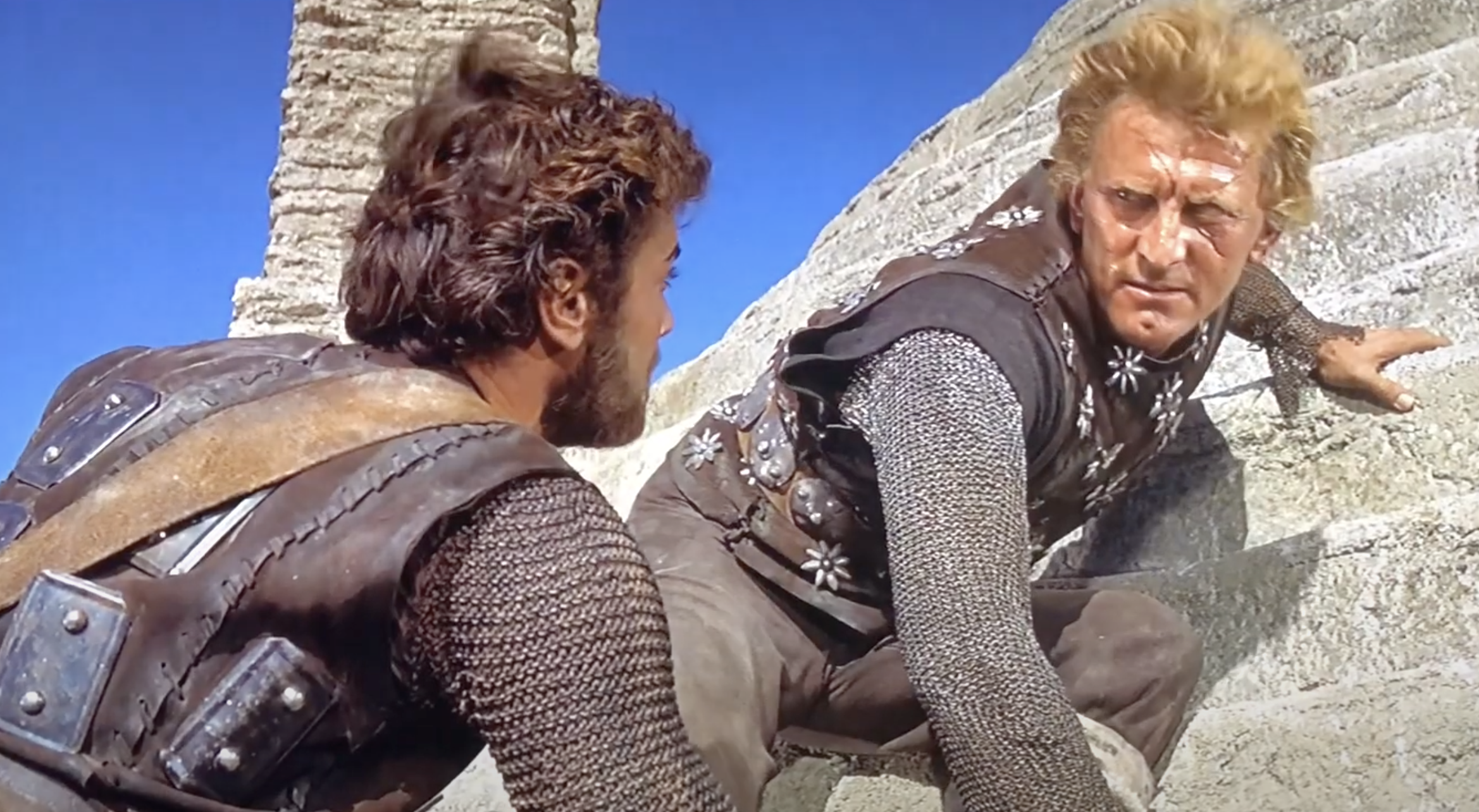 “Ten minutes from the conclusion Janet Leigh‘s Princess Morgana begs Douglas to consider this fraternity, and he angrily brushes her off. But when his sword is raised above a defenseless Curtis at the very end, Douglas hesitates. And then Curtis stabs Douglas in the stomach with a shard of a broken sword, and Douglas is finished.