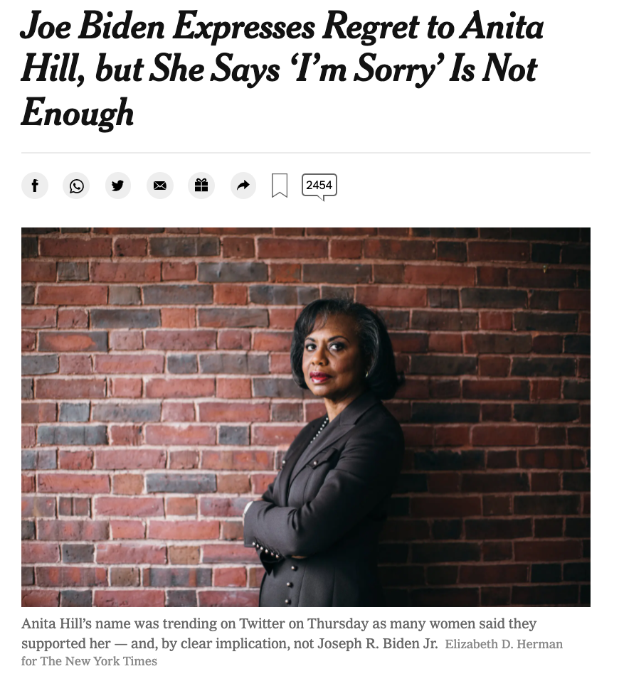 Filed by N.Y. Times reporters Sheryl Gay Stolberg and Carl Hulse on 4.25.19: “On Thursday, the first day of [Biden’s] presidential campaign, his camp disclosed the call, saying[said that] the the former vice president had shared with Anita Hill “his regret for what she endured” 28 years ago, when, as the chairman of the Senate Judiciary Committee, he presided over the confirmation hearings in which she accused Clarence Thomas, President George Bush’s nominee to the Supreme Court, of sexual harassment.