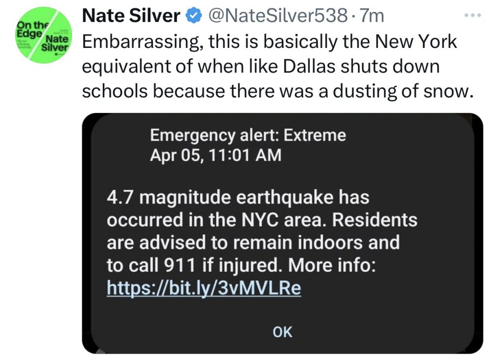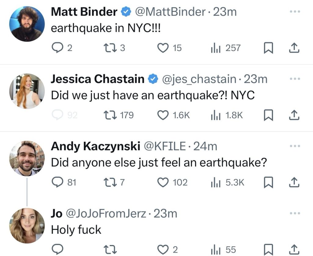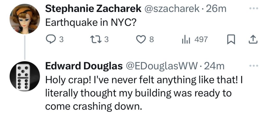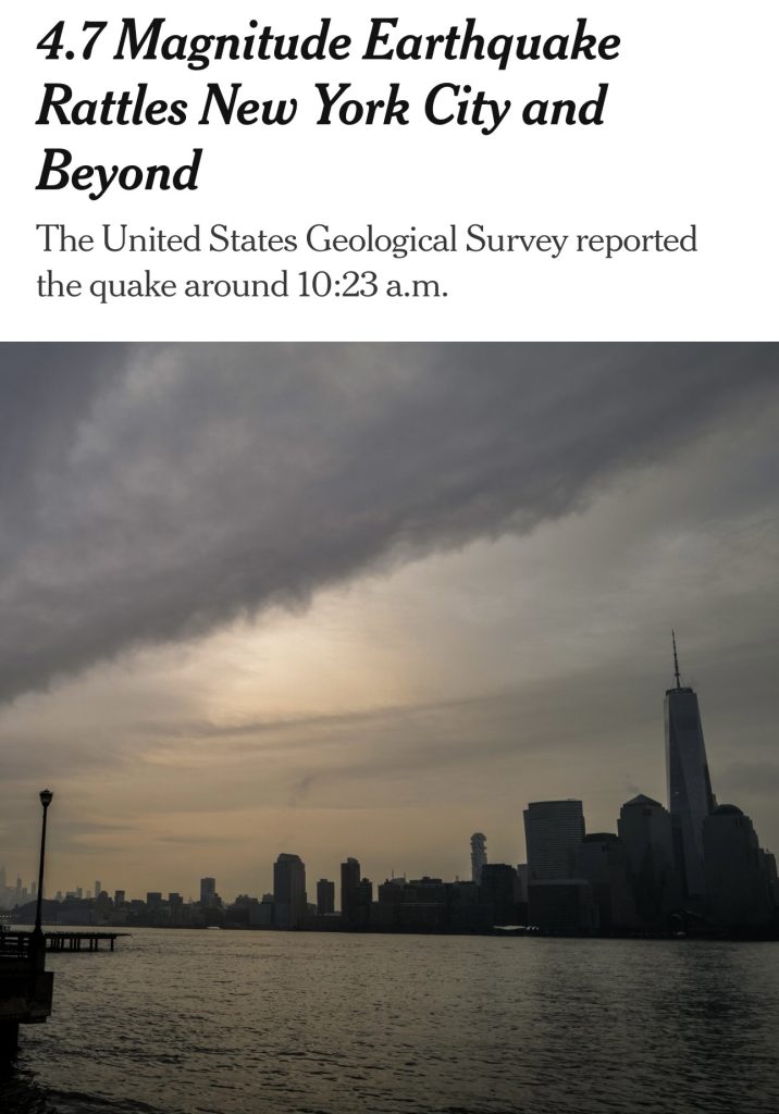 An actual earthquake just happened in Wilton, Connecticut, and apparently all over the tristate area. Not a major shaker but it lasted a good eight to ten seconds. Felt like 5.5 or thereabouts. Reports are calling it a 4.8. Centered in Lebanon, New Jersey.